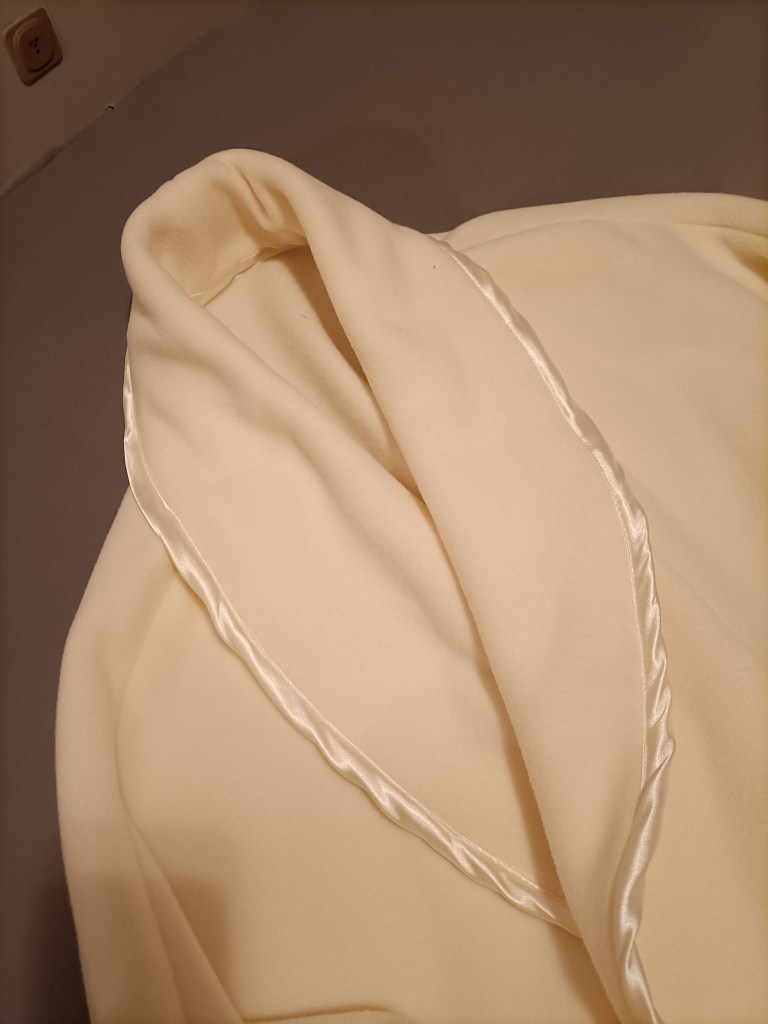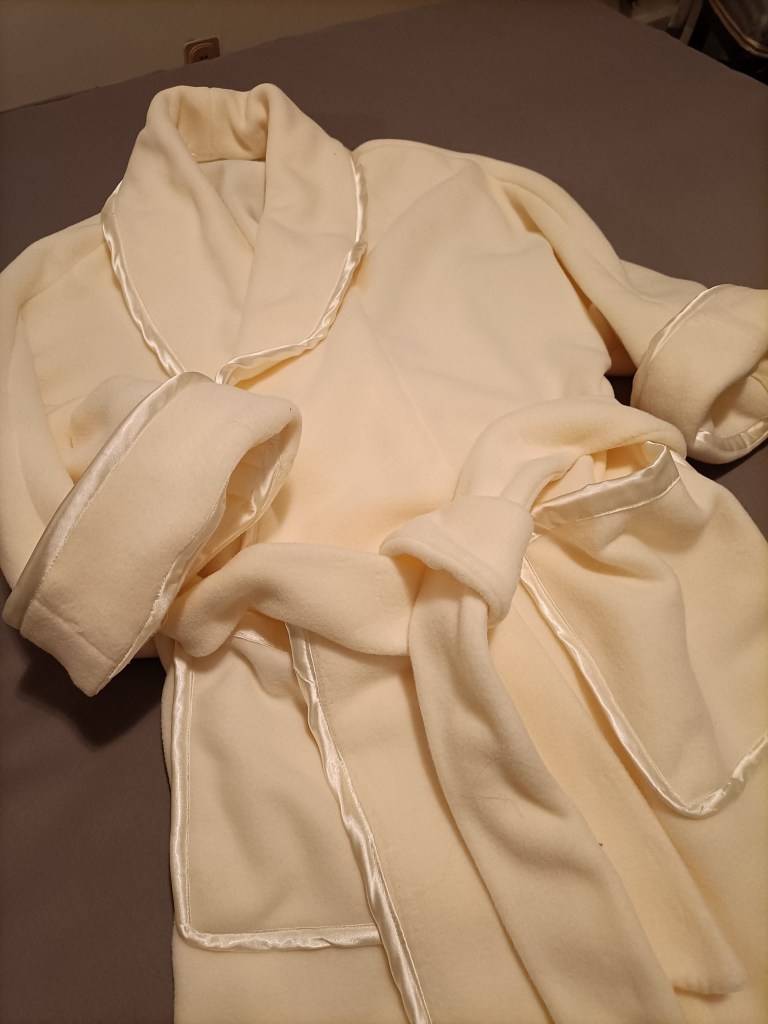 Oggi ho eseguito per una mia cliente una vestaglia in pile bianco rifinita con raso